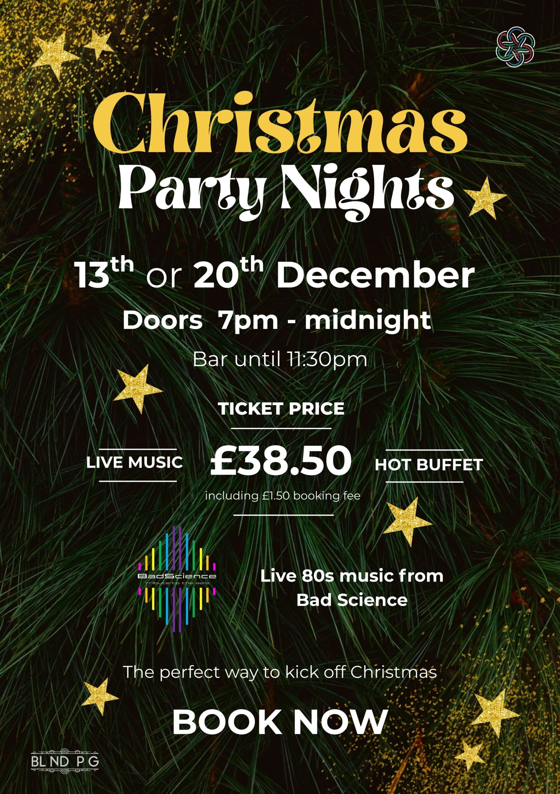 Delicious festive buffet is included in your ticket and for every six tickets bought together *, we will provide a bottle of fizz. Blind Pig bar will, as always, have their beautiful cocktails along with a fully stocked bar.