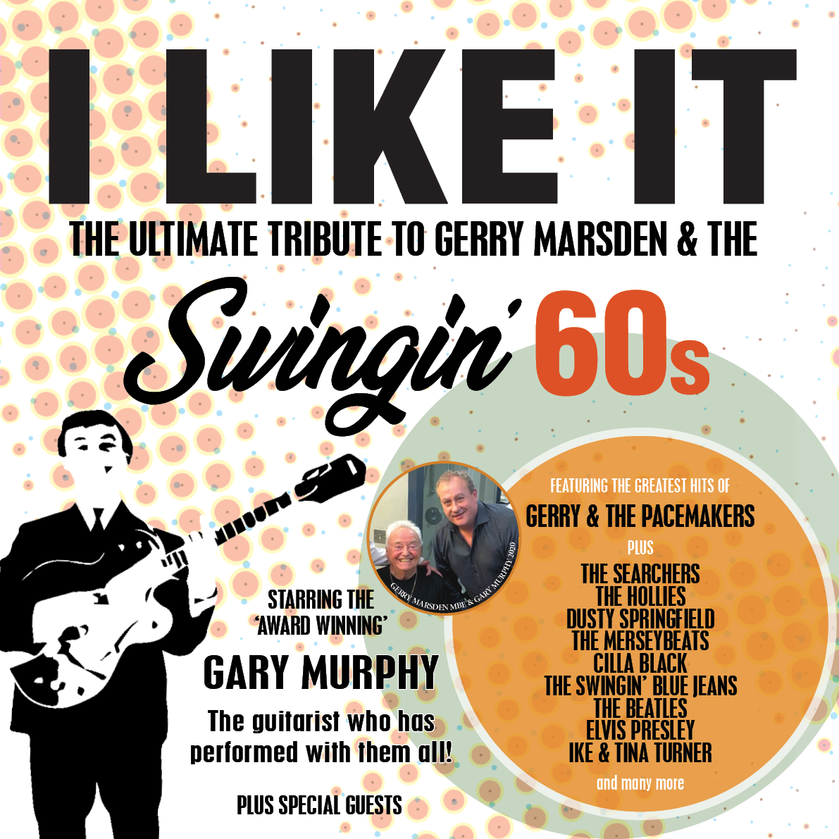 Performed by Gary and his multi-talented band. This swingin’ 60s show features hit songs by Gerry & The Pacemakers, The Beatles, The Searchers, Cliff & The Shadows, Elvis Presley, Ike & Tina Turner, Dusty Springfield, The Merseybeats, The Swingin’ Blue Jeans and The Hollies. Plus… many more classic 60s hits.